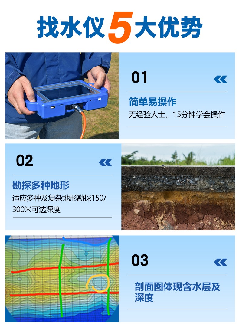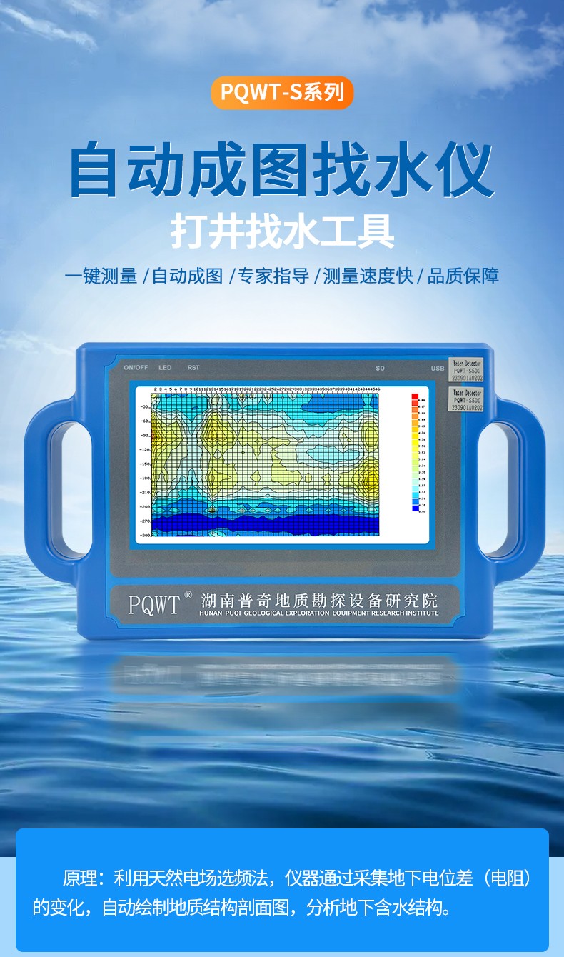 普奇PQWT-S系列是天然电场智能化一键成图打井找水仪是利用天然电场作为工作场源,以地下岩矿石或地下水的电阻率差异为基础,在地面上测量天然电场N个不同频率的电场分量,根据它们的变化规律来研究不同的地质体产生的异常变化情况,达到解决地质问题的一种电法勘探方法。