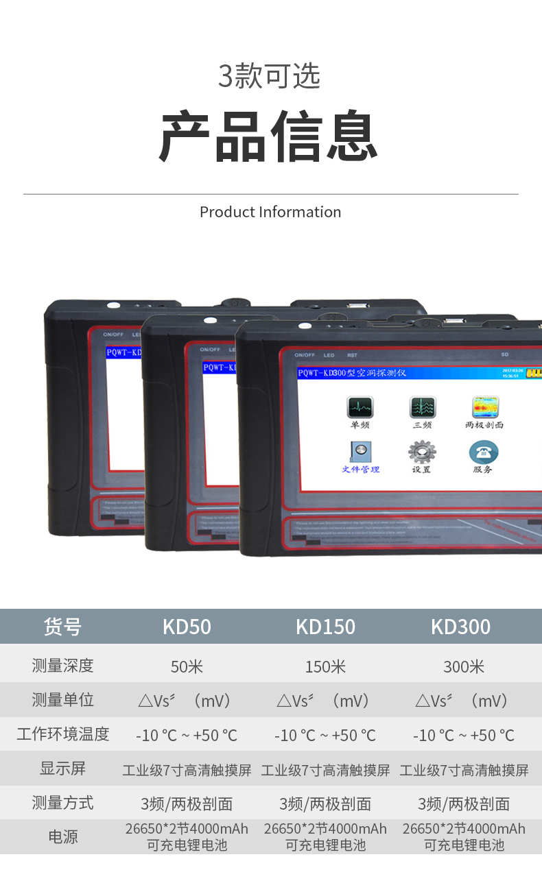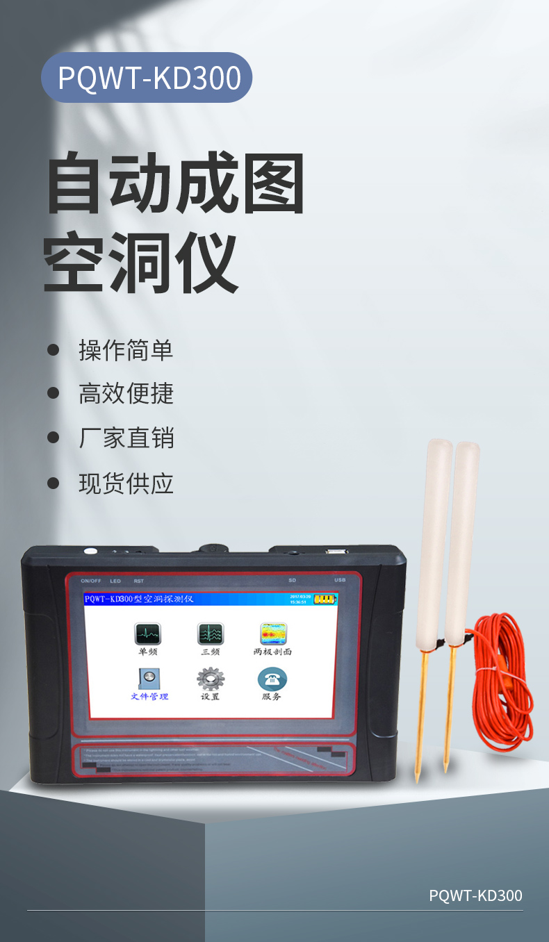 普奇PQWT-KD150地下空洞探测仪是利用大地天然电场源不需要通过人工电场即省略了笨拙的供电系统从而实现了操作简单,仪器轻巧。经过仪器采集的数据通过仪器独有内置的运算功能实现了自动呈现曲线图、地质剖面图,根据剖面图清晰的了解地质层结构,可快速的确定岩层、溶洞、含水层等具体信息 。使用范围:探矿、找水、空洞探测、找矿、工程勘探、地热探测、考古、测井、测水、找水器、探矿器、找矿等