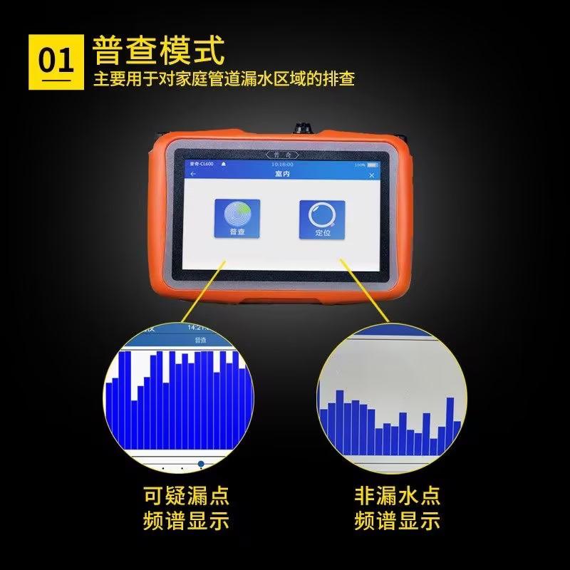 普奇PQWT-L5000 管道漏水检测仪通过传感器将漏水声音信号进行采集,采集后的信号通过主机处理,以可视化频谱及信号柱的方式显示在主机屏幕上,同时声音也会通过主机输出到耳机,通过“听”、“看”两种方式结合,分析判断漏水点。“普查模式”+“定位模式”双重锁定漏水点,能够精准、快速、有效的解决各类家庭管道的漏水问题。